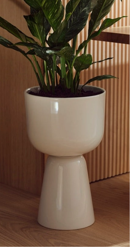 This elegant planter in white glaze will complement any decor. The bowl-like upper portion holds a potted plant while the bottom acts as a stand that can be placed on the floor, a table or stool. Packaged in a tasteful box for gifting.
