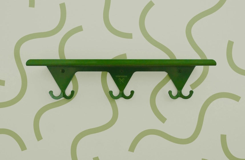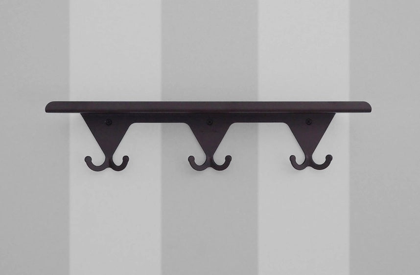 The SR Wall Rack incorporates three SR Wall Hook with a small shelf. Made of powder coated aluminum for durable everyday use, indoors or outdoors. Includes: SR Wall Rack, matching powder coated screws, drywall anchors & instructions.